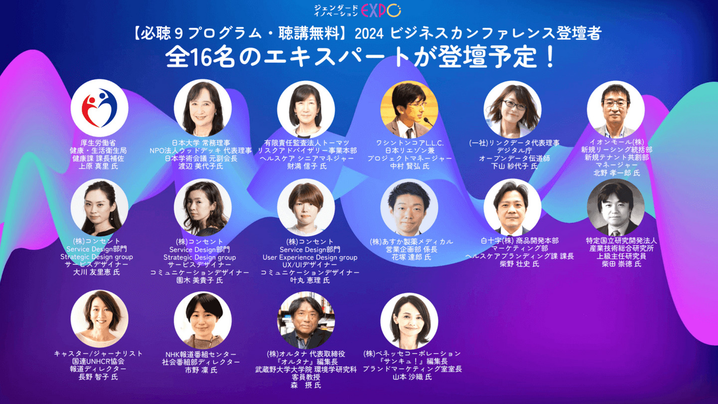 本EXPOでは性差分析による研究開発で誕生した製品・サービスが一同に集結した他、会期中は最新動向をインプットできるビジネスカンファレンスも併催。登壇は厚労省、NHK、産業技術総合研究所、長野智子氏(元報道ステーションキャスター)、トーマツ(デロイトグループ)、あすか製薬、イオンモールなどでプログラムタイトルの一例は下記に掲載。ヘルスケア・医療業界では他業界に先駆けてジェンダード・イノベーション(性差分析)が進んでいることもあり、本カンファレンスはいずれのプログラムも開催前ですでに定員越えとなる盛況ぶりだった。