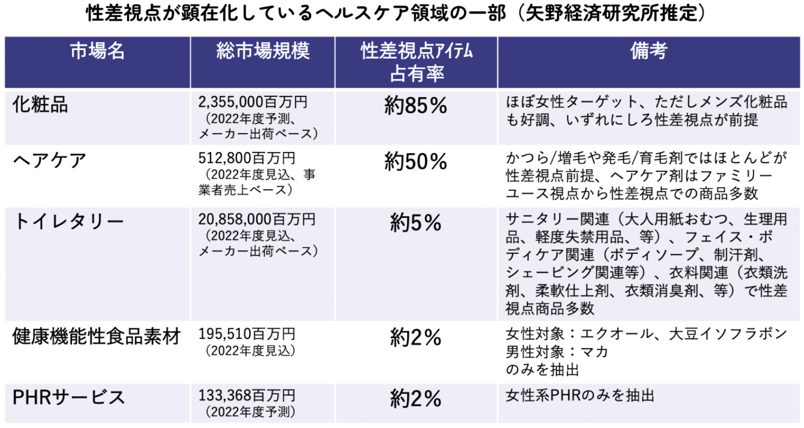 フェムテック市場の調査レポート「フェムケア&フェムテックマーケット2022」をまとめた矢野経済研究所の研究員によれば、ジェンダード・イノベーション視点の潜在市場は10兆円(2022年9月推計)。「ほぼ全ての消費財・サービス分野において、性差視点を掛け合わせることが可能。それにより新ビジネスの創出が可能」とし、消費財・サービス業界全体のうち1%からジェンダード・イノベーション発想の製品・サービスが生まれると仮定すると、10兆円規模を期待できるとのこと。ただしこれはかなり少ない見積もりであるため、性差視点が今後各業界で広まれば、市場規模はさらに膨らむと見ている。ちなみに、ヘルスケア関連領域で性差視点が先行している各市場では、現時点で性差視点アイテムがどれくらいあるのか?同社は「市場に占める性差視点アイテムの占有率」を算出している。先行している市場から学べることは多そうだ。