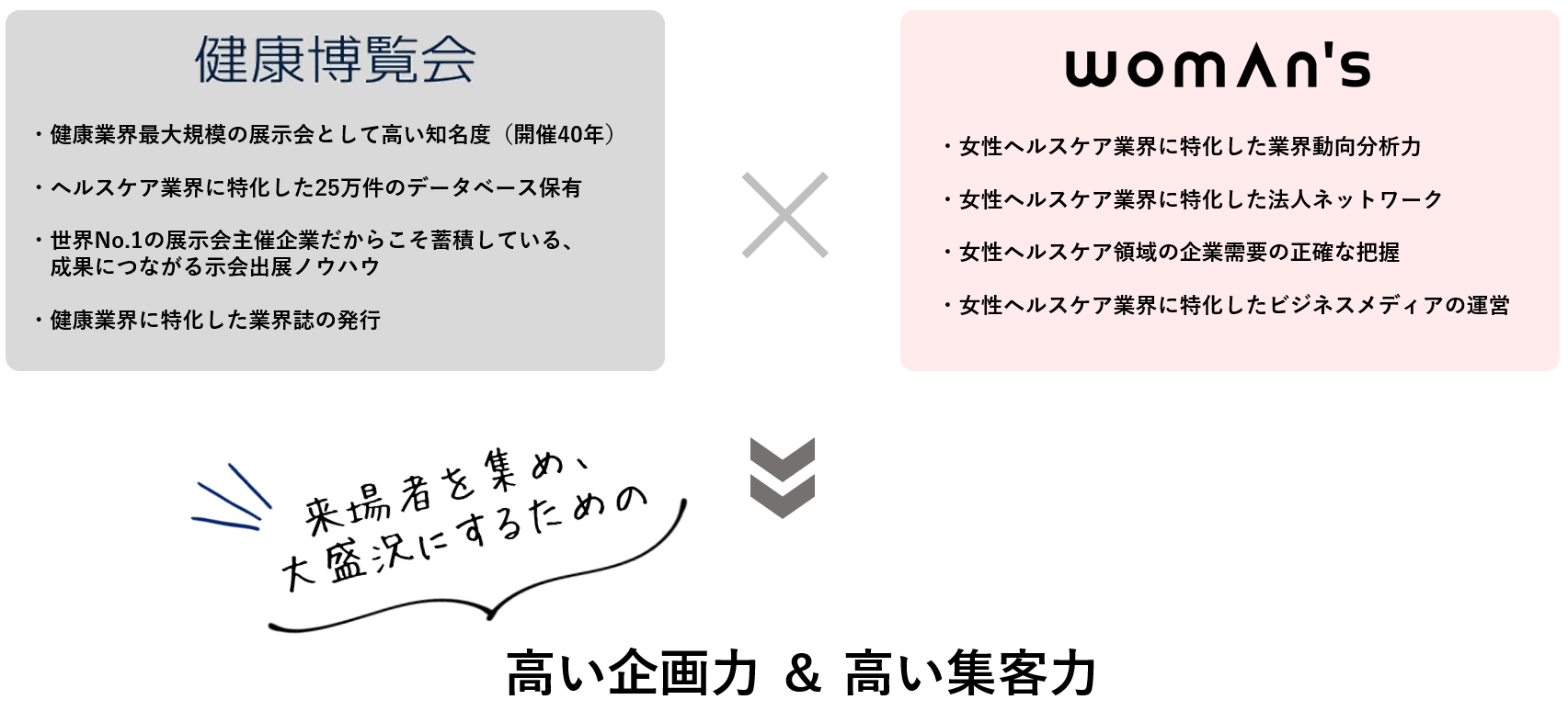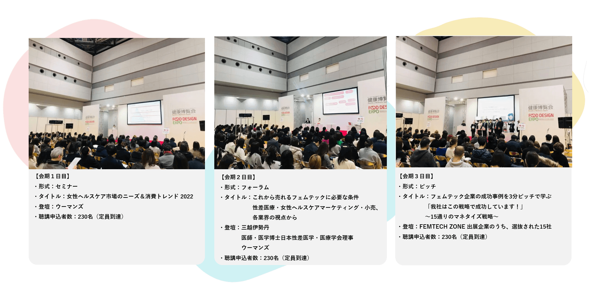 前回開催の「FEMTECH ZONE」は、オミクロン禍の中、さらには大雪警報が出ていたにも関わらず大盛況となりました。会期中に開催した3本のFEMTECH ZONE連動イベントは3本とも定員越えに(各回定員の230名到達)。FEMTECH ZONEのティザーイベント(2021年10月実施)は800人の参加申込となり、健康博覧会×ウーマンズのタイアップ企画は業界内で非常に高い評価をいただきました。私たち2社によるタイアップ企画が他の健康展示会と比較して盛況になる理由は下記です。