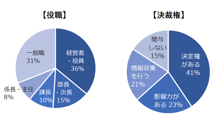 役職者の割合が69%、決裁に関する来場者の割合が85%。意思決定の立場にある担当者と直接出会えるため、取引につながる商談が可能です(下記は2022年2月開催「健康博覧会」の来場者実績より抜粋)。