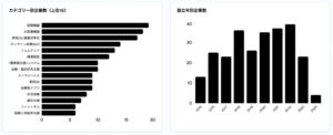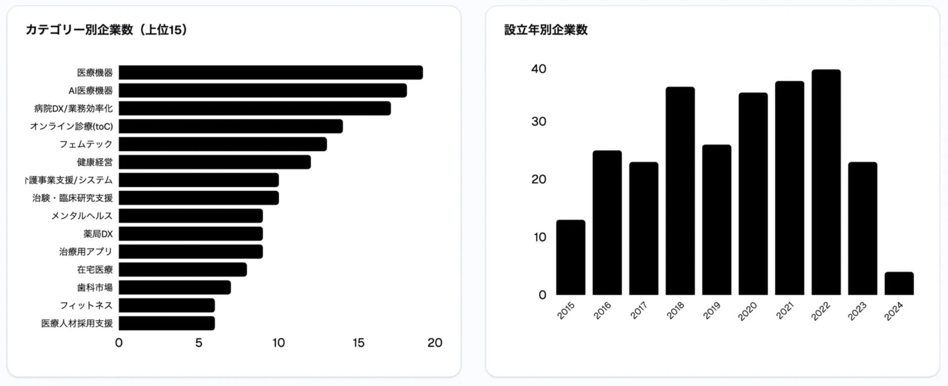 56カテゴリーの中で、掲載企業数が最も多いのは「医療機器」で19社。次いで、「AI医療機器」が18社、「病院DX・業務効率化」17社、「オンライン診療(toC)」14社。「フェムテック」は5位で13社。「健康経営」は6位で12社。