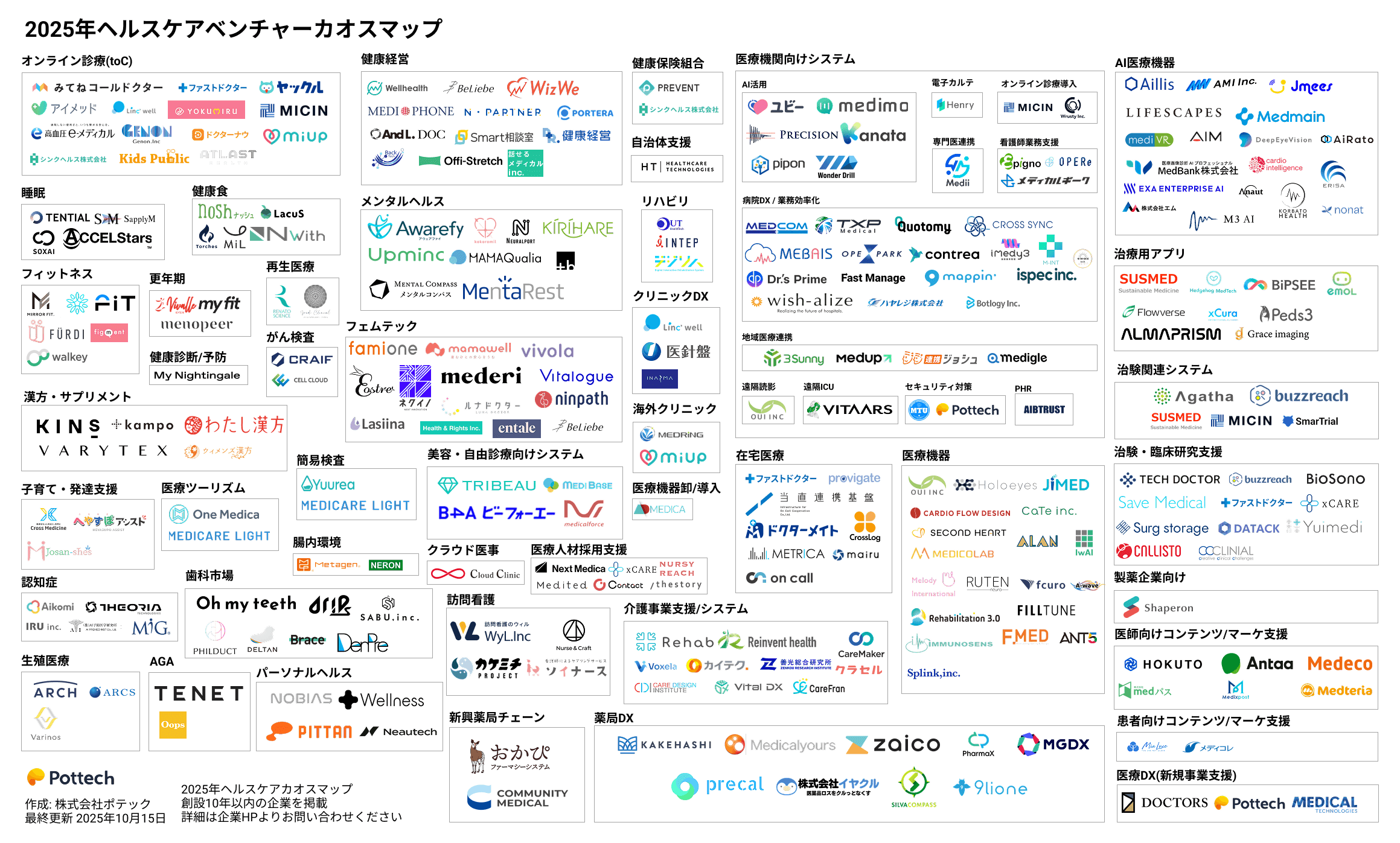 医療・ヘルスケア領域の支援事業を行うポテック(東京・千代田)が、「ヘルスケアカオスマップ2025年版」を公開した。設立10年以内のヘルスケアベンチャー262社を、56カテゴリーに分類して掲載。カオスマップは2019年から作成し、今回で6回目。