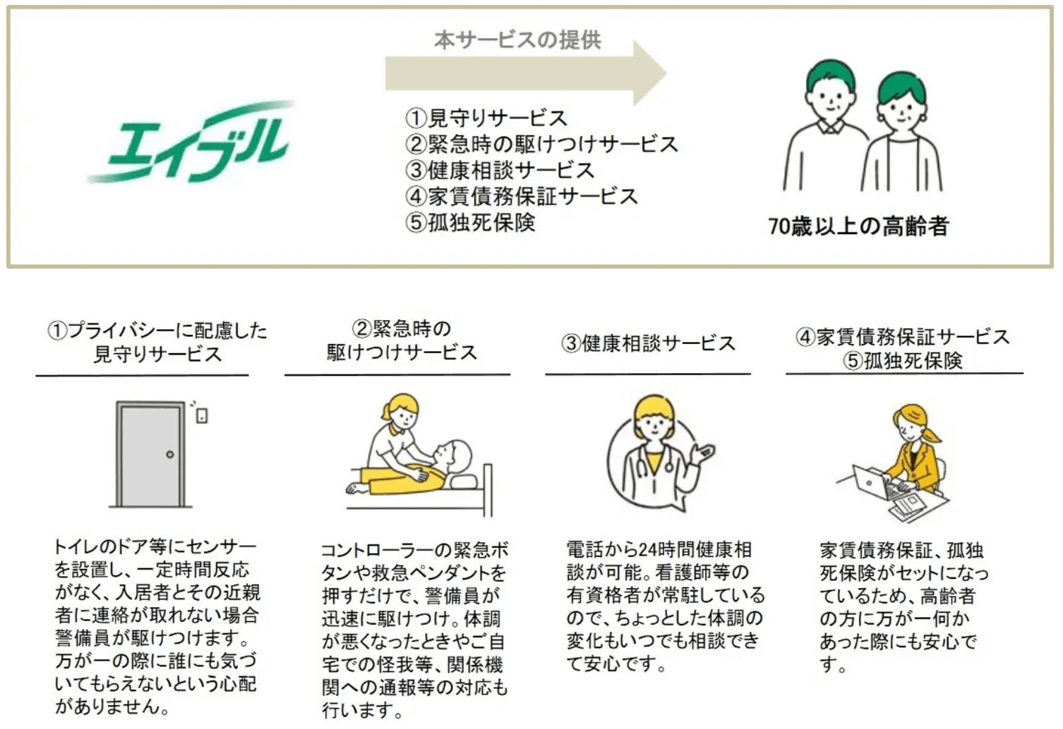 同サービスが狙うメインターゲットは、70歳以上。高齢層でも安心して部屋探しができるよう、セキュリティーサービスのアルソックと、クレジットカードのエポスカードと連携してサービスを構築した。エイブルの管理物件の入居者を対象に、アルソックによる安否確認センサーや緊急通報ボタン、24時間の健康相談サービスを提供する他、エポスカードのカード利用者には、家賃債務保証サービスを無料で提供する。