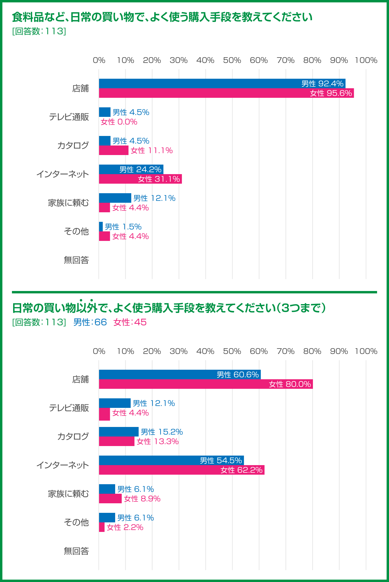 食料品など日常品の購入場所を聞いた質問では、男女ともに「店舗」が9割以上と圧倒的。しかし女性は、日常品の買い物のインターネット利用(31.1%)はもとより、日常品の買い物以外でも「インターネット(62.2%)」の値が有意に高く、オンライン購買を男性より積極的に行っていました。男性のインターネット利用は、日常品の買い物時は24.2%、日常品の買い物以外では54.5%と、いずれにおいても女性との差が際立っています。