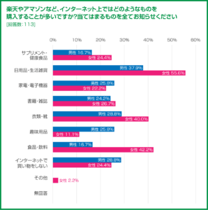 インターネットでよく購入する品目を見ると、男性は「家電・電子機器(25.8%)」や「趣味用品(25.8%)」が目立つ一方、女性は「日用品・生活雑貨(55.6%)」「健康食品・サプリメント(24.4%)」が中心でした。女性の購買行動は、家族全体の生活や健康を支える日常消費に直結しています。店舗での購入が中心だった日用品もECサイト利用が進んでおり、複数の接触ポイントを活かしたO2O施策との親和性が高いと考えられます。