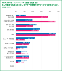 男性が趣味や娯楽系を好むのに対し、女性は「生活お役立ち」や「健康・医療情報」への関心が高く、実用的なコンテンツを重視する。