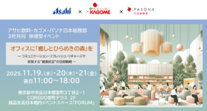 パソナ日本総務部、アサヒ飲料、カゴメの3社は、健康経営やウェルビーイング向上に寄与するオフィスの体験型イベント「オフィスに『癒しとひらめきの森』を」を、今月19日〜21日に都内で開催する。会場内では、各社が提供する健康経営ソリューションを導入したオフィスルームを演出し、来場者にウェルビーイングな空間の体験を提供する。