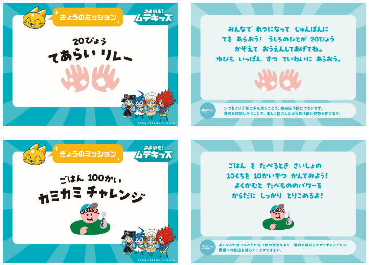 発表会やお遊戯会など、園児が楽しみにする行事が続く秋冬は、保護者や教育現場にとって、園児の体調管理が課題となる季節。こうした背景を踏まえたもので、子どもの免疫ケアに、「免疫ケア推進園」と家庭が連携して取り組む3週間のプログラム。平日は、園で日替わりで「けんこう大臣」に任命される園児が、手洗いなどのミッションをクリアするため、クラスをリードする。週末は、家庭で保護者が子どものミッション達成を確認する。園の教員には「iMUSE 免疫ケアサプリメント」を、保護者には「おいしい免疫ケア ペットボトル」を無償提供し、大人の免疫ケアも図る。
