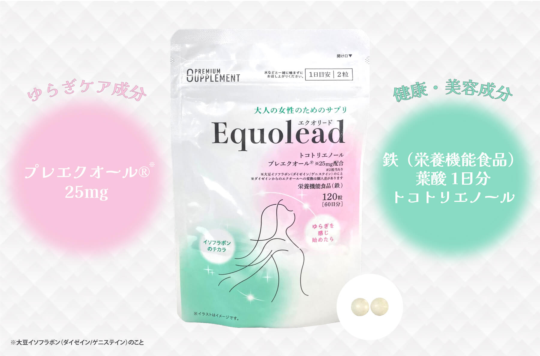 全国で調剤薬局を展開する日本調剤は今月、40代以降の女性の心身が変化する時期に対応するサプリメント「Equolead(エクオリード)」を発売した。体内でエクオールに変換される前駆体成分「プレエクオール」や、トコトリエノール、葉酸、鉄など、女性に不足しがちな栄養素を配合した。プライベートブランドのサプリメントシリーズ「PREMIUM SUPPLEMENT(プレミアム サプリメント)」の第4弾。成分と配合量にこだわった、調剤薬局ブランドならではの高品質サプリとして打ち出す。