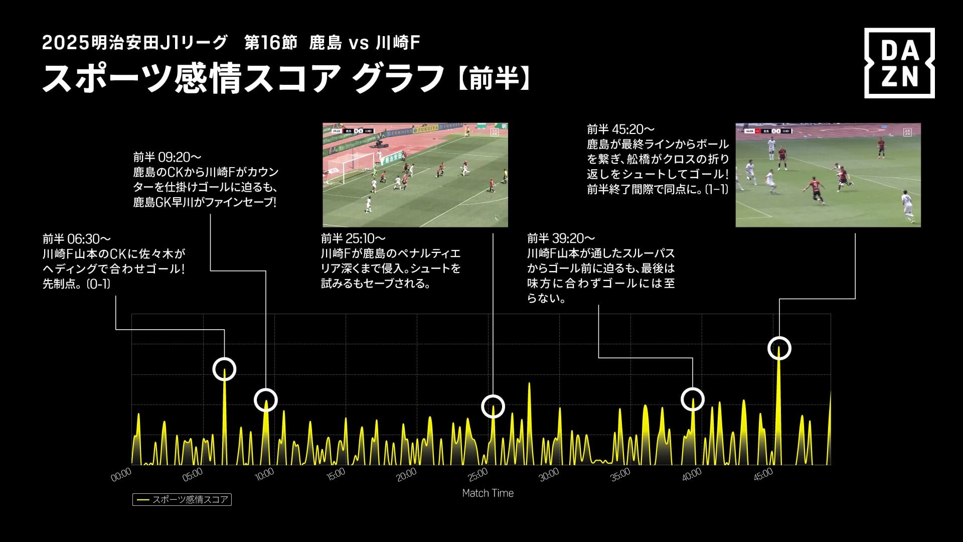 試合映像や音声、選手のプレー位置など、複数の情報をAIで解析し、試合単位で視聴者の感情の動きを定量的に算出する仕組み。勝敗や得点だけでなく、プレー展開のドラマ性や緊迫した局面、スタジアムの歓声なども加味し、スポーツ観戦時の熱量を定量的に捉える点が特徴だ。