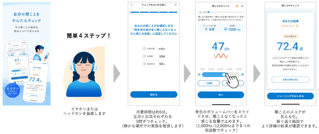 同アプリは、スマートフォンで簡単な「聞こえのチェック」と「耳トレーニング」を行えるのが特徴。約5分の測定で聴こえの状態を測定し、独自のスコアで可視化する。結果に応じてユーザーの耳に合った周波数を選択し、イヤホンから再生される「ぎりぎり聞こえない音」を聞くことで、聞こえ方を鍛えることができる。推奨時間は1日60分。日々のチェック結果やトレーニング履歴はアプリ内に記録され、スコアの推移も確認できる。