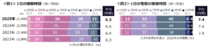 調査は20~69歳の男女2,500人に実施。普段の睡眠時間と理想の睡眠時間を聞いたところ、普段の睡眠時間は「6時間くらい」が36%とボリュームゾーンで、平均は6.3時間。昨年よりやや短くなった。一方、理想の睡眠時間は「7時間くらい(33%)」と「8時間くらい(40%)」がボリュームゾーン。平均は7.4時間で、昨年と変わらなかった。普段の睡眠時間と理想の睡眠時間のギャップは1.1時間だった。