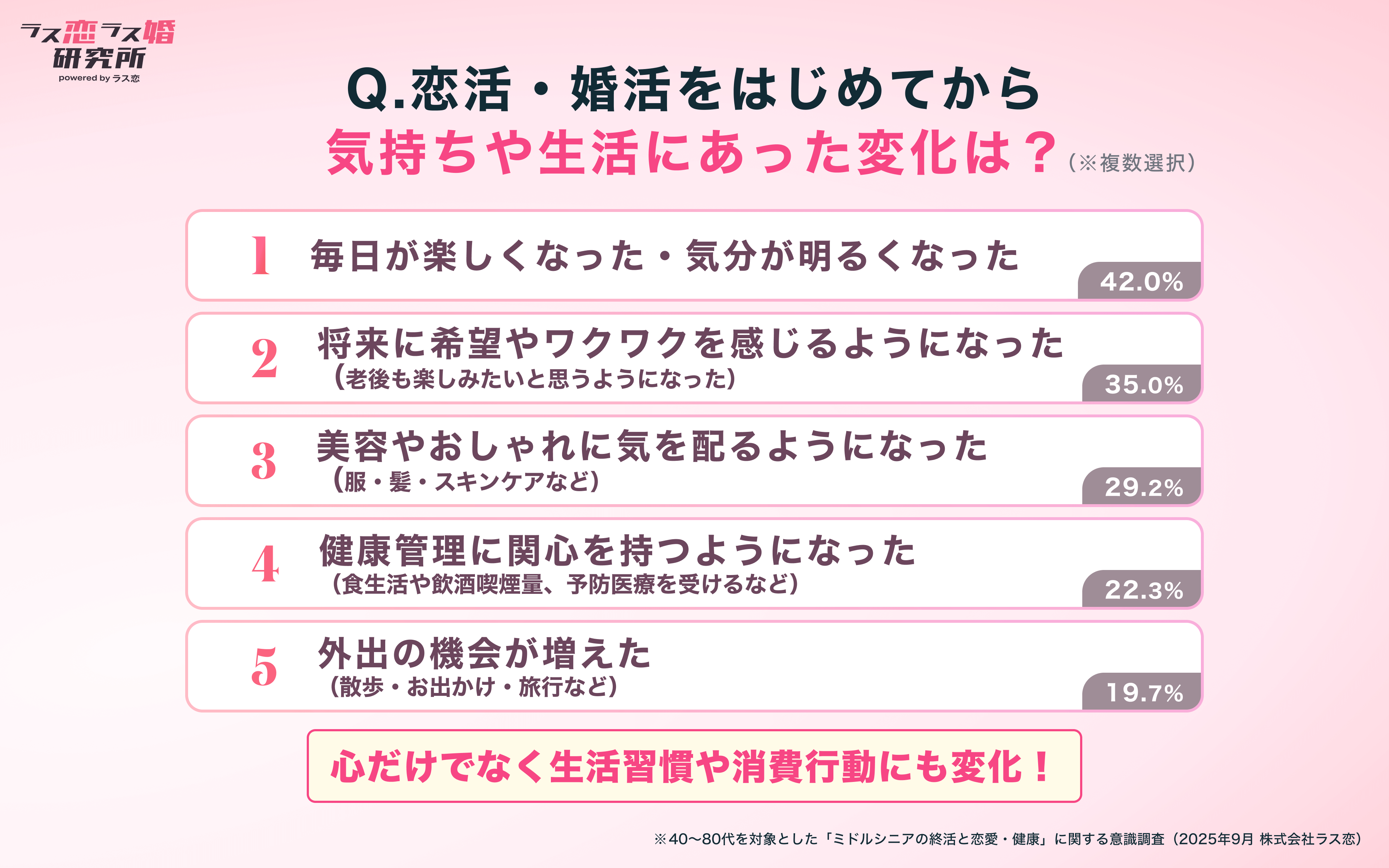 悪しき生活習慣を断ち切らせ、瞬時に健康行動を習慣化させるーー。そんな効果てきめんの行動変容施策は、恐怖訴求のテレビ番組でも理論に基づいたメソッドでもなく、単純に「恋」のようだ。40代以上の恋活・婚活マッチングアプリ「ラス恋」を運営するアイザック(東京・渋谷)が、終活と恋愛・健康に関する興味深い意識調査を実施した。