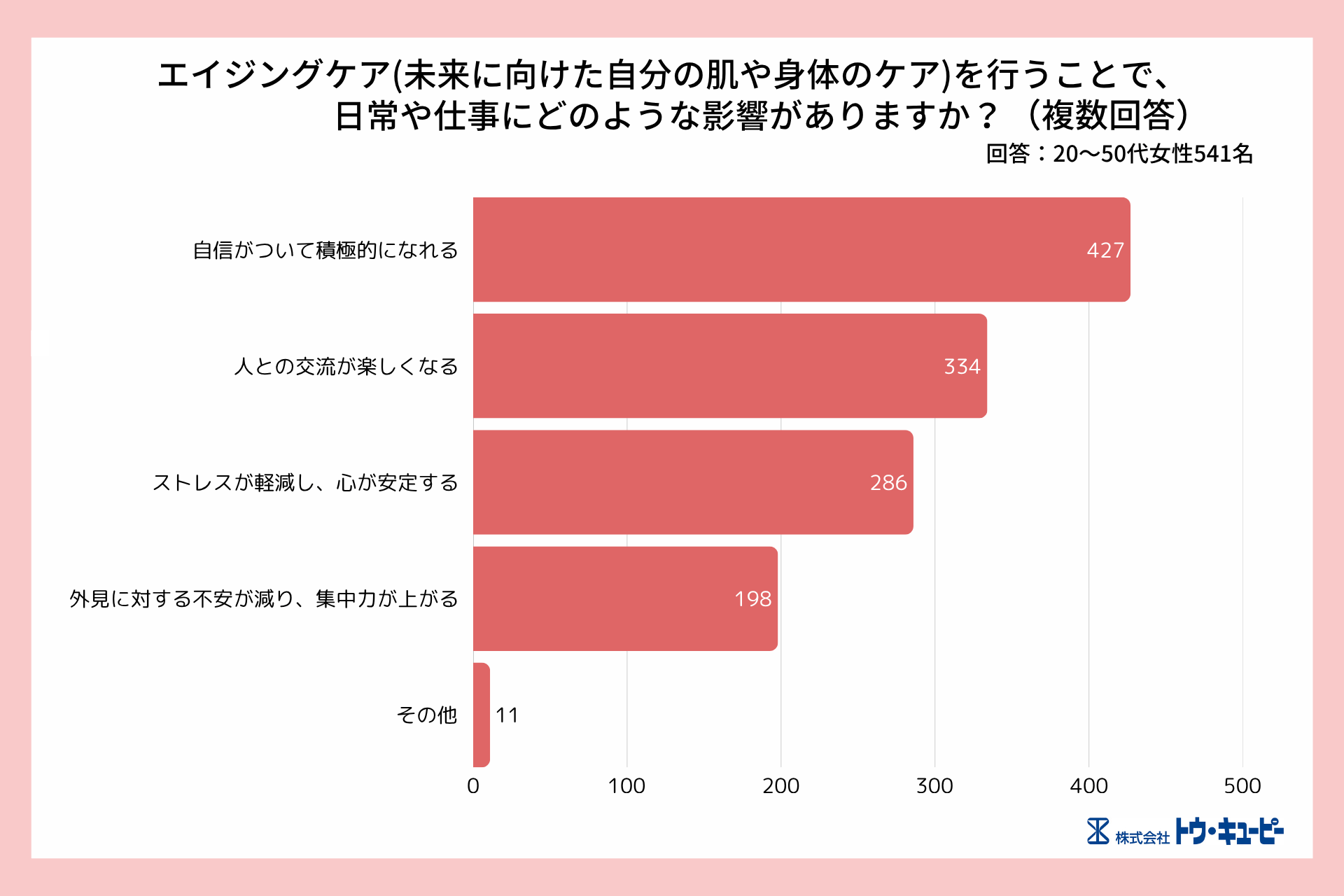 続いて、エイジングケアによる影響を尋ねた。「エイジングケアを行うことで、日常や仕事にどのような影響があるか?」という質問では、最多が「自信がついて積極的になれる」で78.9%。「人との交流が楽しくなる(61.7%)」「ストレスが軽減し、心が安定する(52.9%)」が続いた。自己肯定感が上がることで、ウェルビーイングが高まることがわかった。