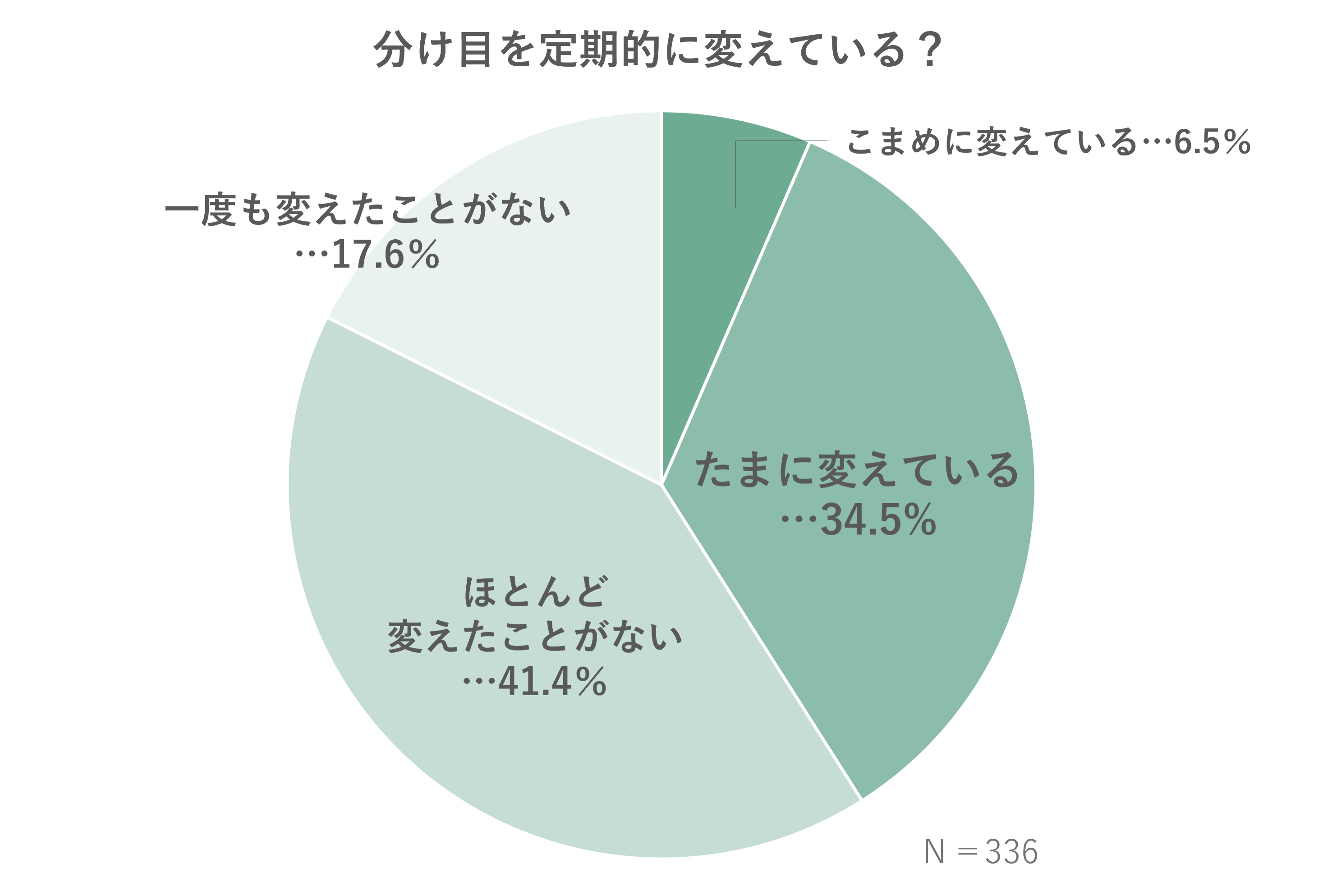 続いて、普段の髪型事情についても聞いた。「分け目を定期的に変えているか?」という質問に、「変えている」は41%。一方で「変えたことがない」は59%となった。同じ分け目やヘアスタイルを続けることは頭皮の特定の場所に負担がかかるものの、リスクを高めてしまう行動を取っている女性が、半数以上を占めた。
