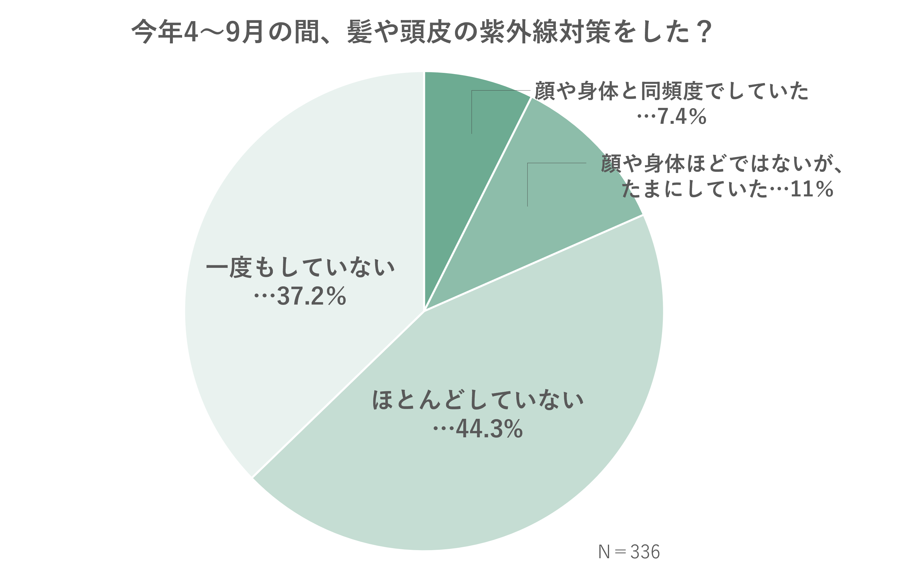 髪や頭皮の紫外線対策についても聞いた。「今年の4~9月の間、髪や頭皮の紫外線対策をしていたか?」という質問に、「顔や身体と同じ頻度で対策していた」または「顔や身体ほどではないが対策していた」と回答したのは合わせて19%。残りの約8割の女性が、ほとんどまたは一度も髪や頭皮の紫外線対策をしていないことがわかった。頭皮の分け目部分は、紫外線のダメージを直接的に受けやすいものの、対策に取り組まない女性が圧倒的多数を占めることが明らかになった。