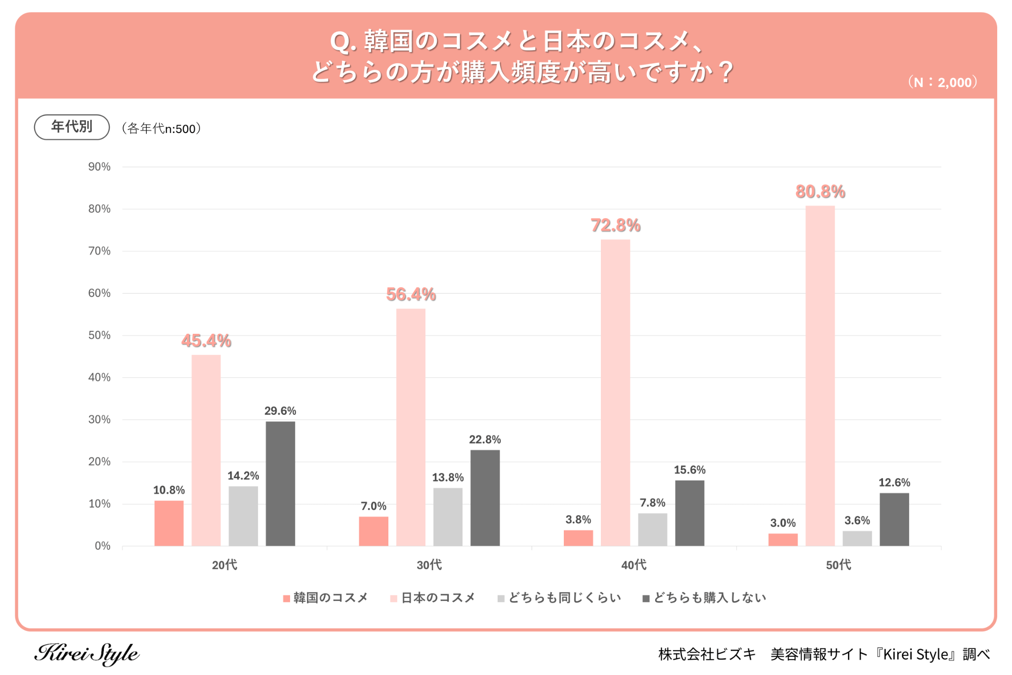 対照的に、日本コスメの購入頻度が高い層は年代とともに増加し、50代では80.8%に達した。若年層はトレンドの韓国コスメも積極的に取り入れる一方、中高年層では、品質や長年の使用感への信頼から日本コスメを選択する傾向が強まる様子がうかがえる結果となった。