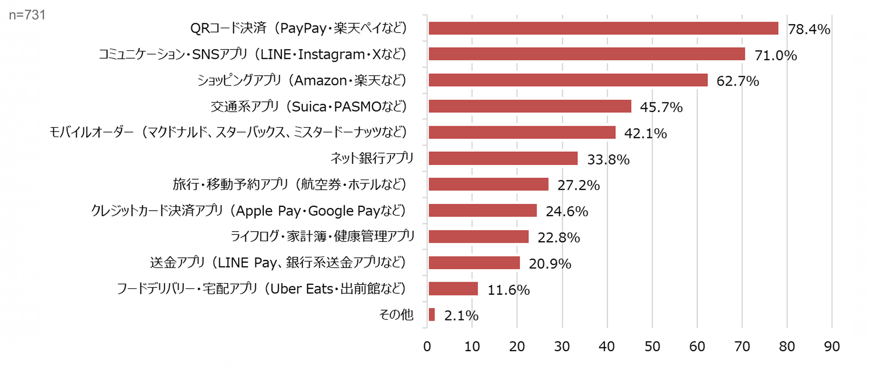 普段利用するスマホ決済やアプリについての調査では、全体の6割以上が「QRコード決済」と「ショッピングアプリ」を利用しており、これらが生活インフラの一部となっていることがうかがえます。中でも「QRコード決済」の利用率は約8割と高い結果になりました。また、「コミュニケーション・SNSアプリ」も高水準。一方で、「フードデリバリー・宅配アプリ」や「ライフログ・家計簿・健康管理アプリ」の利用は限定的という結果になりました。