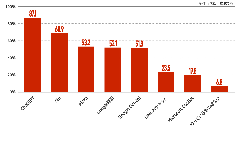 生成AIの認知度について聞くと、トップは「ChatGPT」で認知度も87%と、生成AIの代名詞的存在となっていました。次いで「Siri(69%)」「Alexa(53%)」「Google翻訳(52%)」「Google Gemini(52%)」が入り、「知っているものはない」は6.8%にとどまりました。つまり、9割以上の人が何らかのAIサービスを認知していることになります。