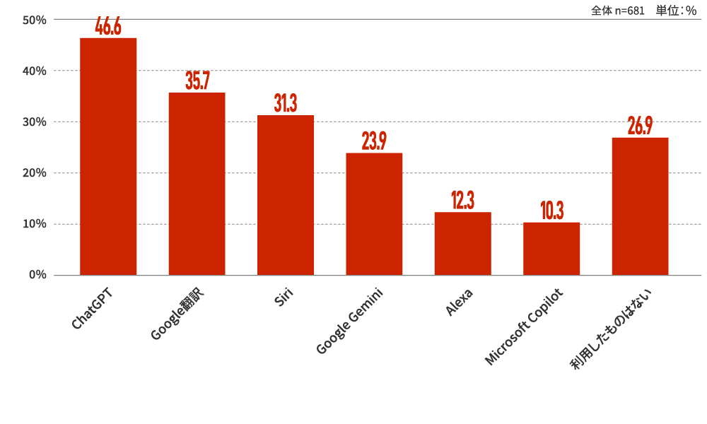 実際に利用したことがあるAIサービスでも、全体では「ChatGPT」が最も多く、認知している人(87%)のうち約半数が実際に利用しているという結果になりました。次に「Google翻訳(36%)」「Siri(31%)」「Google Gemini(24%)」と続きます。一方で「利用したものはない」も27%おり、認知はしていても活用には至っていない層も一定数見られます。