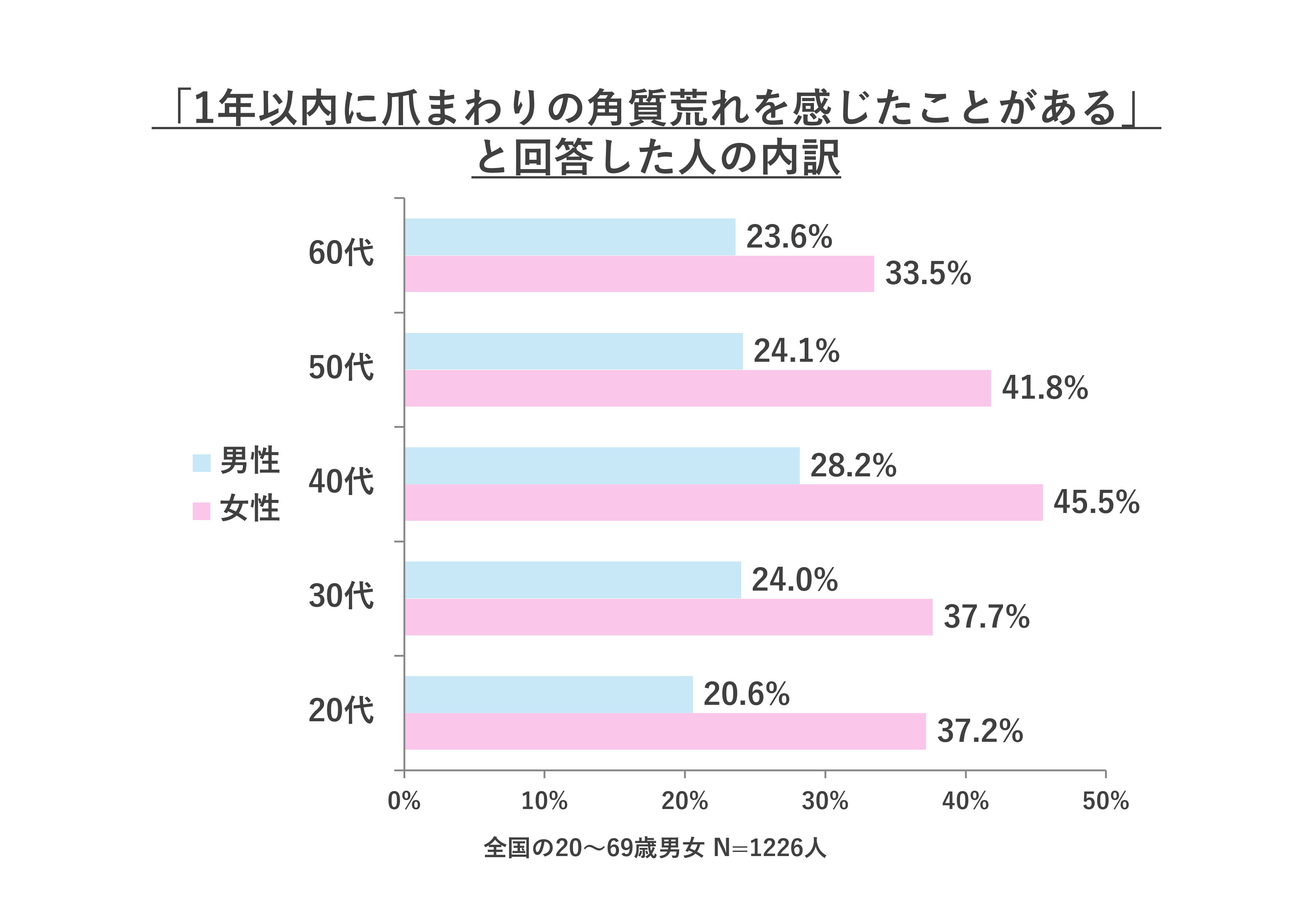 続いて、「1年以内に爪まわりの角質を感じたことがある」と回答した1,226人に着目。内訳を見ると、全年代で女性の方が症状経験率が高く、特に40〜50代の中年層で目立った。