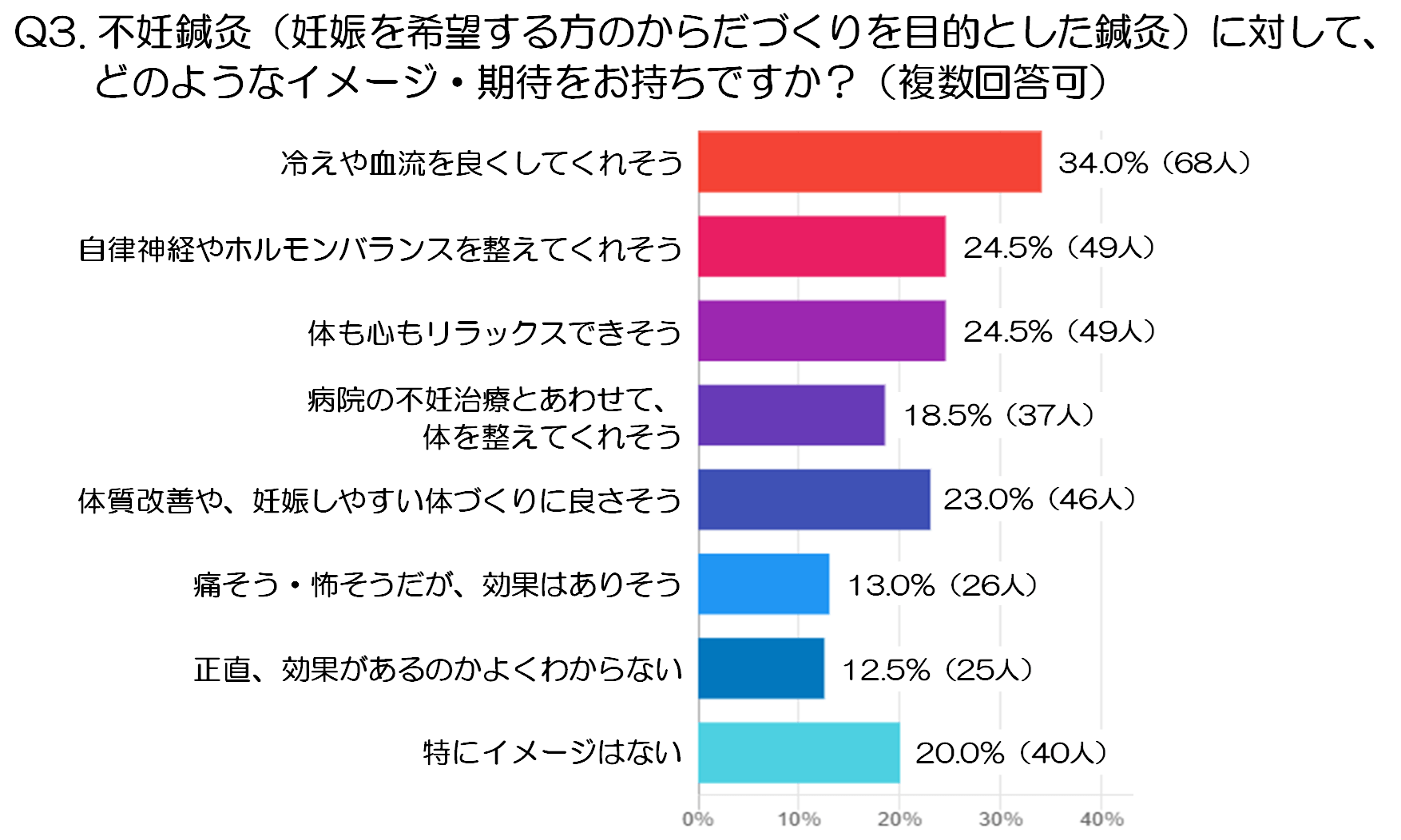 妊活のための体づくりを目的とした鍼灸のイメージを聞いた質問には、「冷えや血流を良くしてくれそう(34%)」「自律神経やホルモンバランスを整えてくれそう(24.5%)」「リラックスできそう(24.5%)」と、ポジティブな声が上位に上がった。妊活の効果を期待する声も見られ、「体質改善や妊娠しやすい体づくりに良さそう」は23%で、「効果がどの程度あるのか、科学的な根拠が気になる」は12.5%にとどまった。