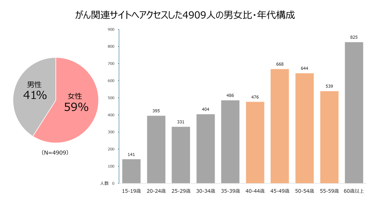 年代構成を見ると、40代と50代が全体の約47%を占めました。また、男女比では約6割が女性であり、がん関連サイト未接続を含めた全体12,969人の比率(男性53%、女性47%)と比べると、女性が比較的多く関連サイトに接続していました。