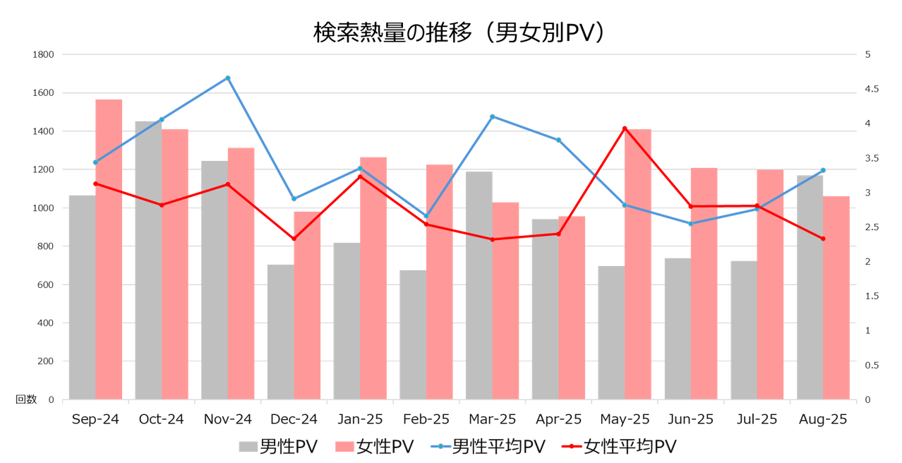 男女共通の特徴として、12月はアクセス急減が見られ、ピーク時の10月(2,861PV)や9月(2,632PV)と比較し、12月は1,683PVまで落ち込みます。この時、訪問人数(UU)の減少率は3.5%に留まっていますが、閲覧回数(PV)は34%と大きく減少しています。 年末は多忙な時期のため、生活者が「サイトを訪れはするが、深く読まずに離脱している」ことが考えられます。