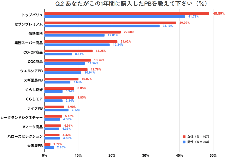 直近1年間に購入したPBについては、男女ともにトップ3は「トップバリュ」「セブンプレミアム」「情熱価格(ドン・キホーテ)」だった。前問同様に、全体的に女性の購入率が高い結果に。男性の方が高かったのは「ライフPB」「ハローズセレクション(ハローズ)」「大阪屋PB」だった。