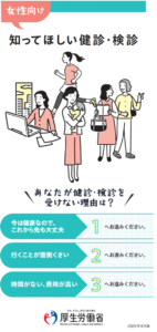 女性の年齢に応じた健診・検診の重要性を伝える、「女性向け 知ってほしい健診・検診(厚生労働省)」。生活習慣病やライフステージごとの婦人科系疾患の予防行動促進を目的としたもので、健診・検診をためらう理由別に行動を後押しする情報をコンパクトに掲載。各種がんや生活習慣病の健診・検診内容を、対象年齢別に紹介。子宮内膜症、子宮筋腫、卵巣のう腫、卵巣がんなど、女性に特有の疾患は増加傾向にあり、早期発見・早期治療が病気の進行や妊娠トラブルの予防になるため、定期的な受診を推奨している。