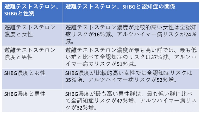 研究結果は以下表の通りとなりました。これらの結果から著者らは、「高SHBGおよび低遊離テストステロン状態が、女性も男性もともに将来の認知症やアルツハイマー病の発症リスクと関連している可能性がある」と述べています。血液中で活性化を持つ遊離テストステロンが高値であるほど認知症のリスクが低く、一方でSHBGによってホルモンが結合されてしまうと、血液中で活性化を持つ遊離テストステロンが低値となり、リスクが上がるという仕組みがこのような結果をもたらしたものと考えられます。これらの結果は、性ホルモン濃度と認知症発症の間に統計的な関連があることを示唆していますが、因果関係を明らかにするためにはさらなる研究が必要であると論文では結論づけられています。