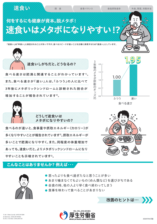 肥満・メタボの改善が必要な人に向けた支援ツール「5種の栄養・食生活ツール(厚生労働省)」。早食い、間食、食事バランス、食塩摂取過多、外食の5種の食習慣ごとに、食習慣が健康に与える影響や、日常で取り組める食習慣の改善方法を紹介。支援者が同ツールを活用する上でのポイントをまとめた、別冊の解説書と併せて読むのがおすすめ。