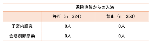 その結果、両グループとも産後1ヵ月健診までに子宮内膜炎や会陰創部感染は確認されなかった。また、入浴許可グループでは入浴満足度が有意に高かったほか、産後うつのリスク指標や会陰部痛・骨盤痛の割合も低い傾向が見られた。