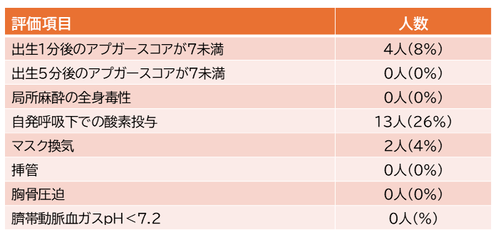 その結果、これらの方法で出生した新生児の麻酔薬濃度はいずれも呼吸抑制を引き起こす濃度ではなく、安全性を再確認した。また、新生児の全身状態を評価する指標であるアプガースコア(各項目を0~2点で評価し、合計7点以上を良好とする指標)では、出生5分後にこのスコアが7未満だった新生児はおらず、全員良好な状態であった。