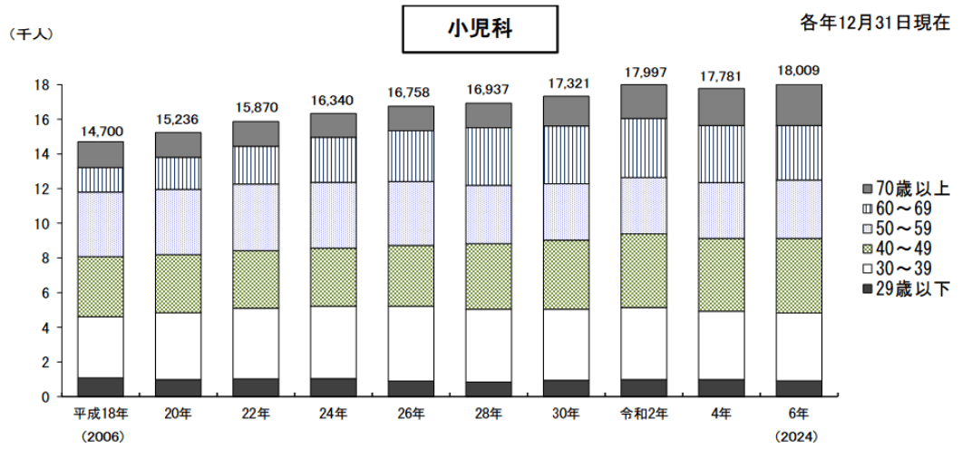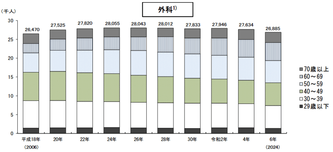 診療科別(主たる診療科)の動向には明暗が分かれた。少子化対策や成育医療の充実が叫ばれる中、小児科医は1万8009人と前回より228人(1.3%)増加した。女性医師の割合が高い同科において、長時間労働を是正するためのチーム医療への移行が進んでいることや、発達障害やアレルギーなど医療ニーズの多様化に対応できる、より手厚い診療体制が求められている背景がある。一方で、外科(呼吸器外科、心臓血管外科などを含む外科系全体)は前回調査から減少傾向が続いており、産婦人科・産科も1万1690人と、前回から143人減少した。特定の診療科の医師不足は、地域で必要な医療が受けられなくなる事態に直結するため深刻だ。