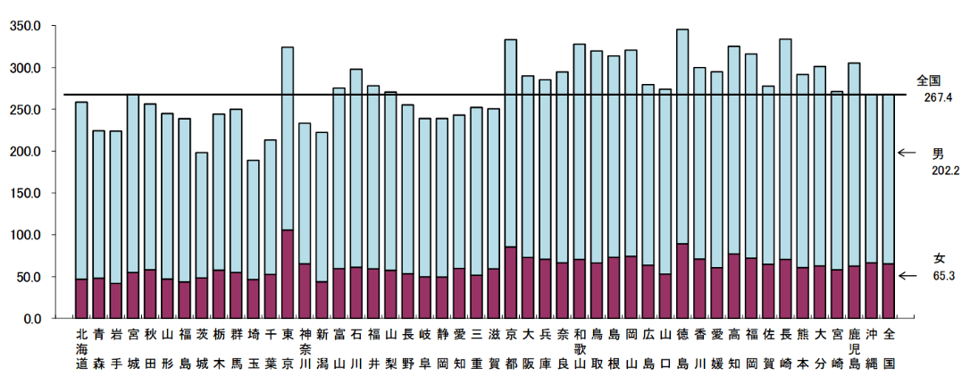 人口10万人当たりの医療施設に従事する医師数は全国平均で267.4人となり、前回より5.3人増加した。しかし、都道府県別に見ると、最も多い徳島(345.4人)と、最も少ない埼玉(189.1人)の間には約2倍の開きがあり、地域による医師数の偏在は依然として解消されていない。